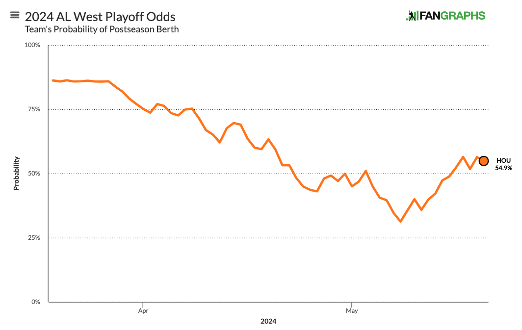 Ultimately, the Astros have increased their playoff odds by nearly 25 points during this winning stretch of baseball.