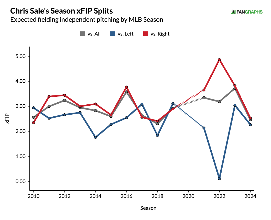 I must correct myself, as I accidentally said that his changeup neutralizes lefties when the pitch actually neutralizes righties. Over the past few injury-filled seasons, Sale’s posted pretty considerable platoon splits, mainly because he’s an across-the-plate slider-reliant pitcher, with the slider breaking into the zone on right-handed hitters.