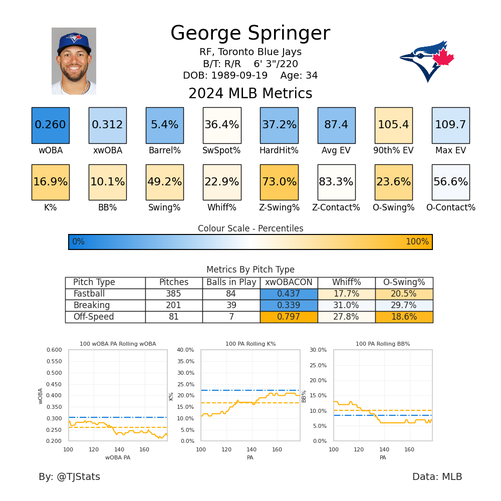Additionally, Springer might be past his power prime. His max exit velocity this year is a measly 110 mph, nearly four points lower than any other season. His barrel rate has dropped to a career-low 5%. He’s struggling to hit fastballs and breaking balls.