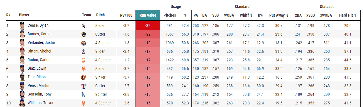 Cease masterfully pairs a 97 mph with an 87 mph slider. His slider has been the single best pitch in baseball this year by a wide margin. Hitters have a .177 wOBA against it with a 42.3 K%.
