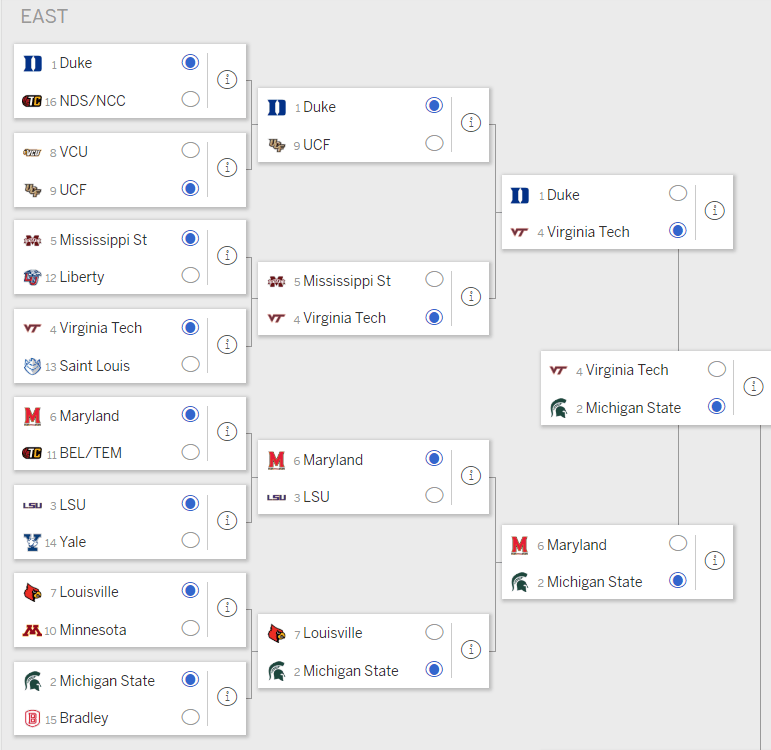 Once more, we'll pick against Duke as it is being picked more than it should. We simply move down to the next line and take Michigan State who we would expect to get there 24.8% of the time, but are only being selected in 13.5% of brackets.