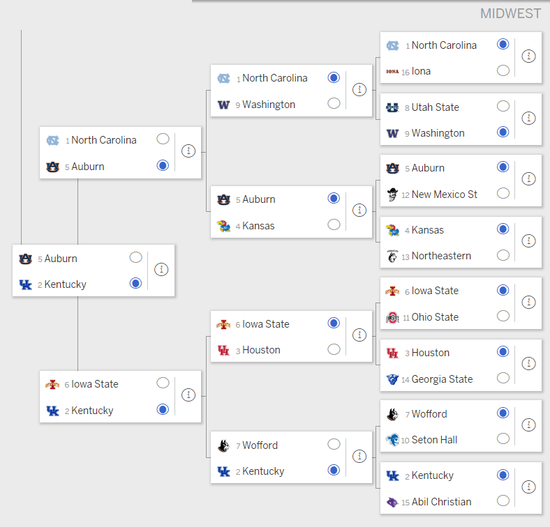 This isn't exactly rocket science here. Our projections actually have Kentucky as the favorite to come out of this region, but most entries are lining up to take the chalk in North Carolina. It's rare, but Kentucky is actually being overlooked in this spot.