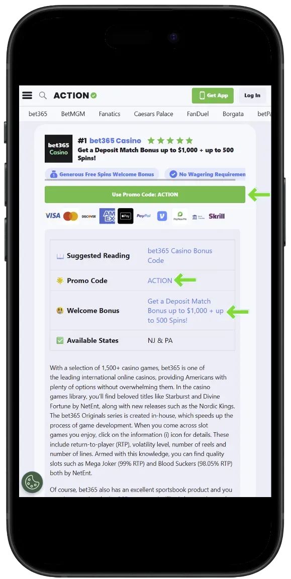 | ๐ Bonus Code (MI, NJ, & PA) | ACTIONCASINO |