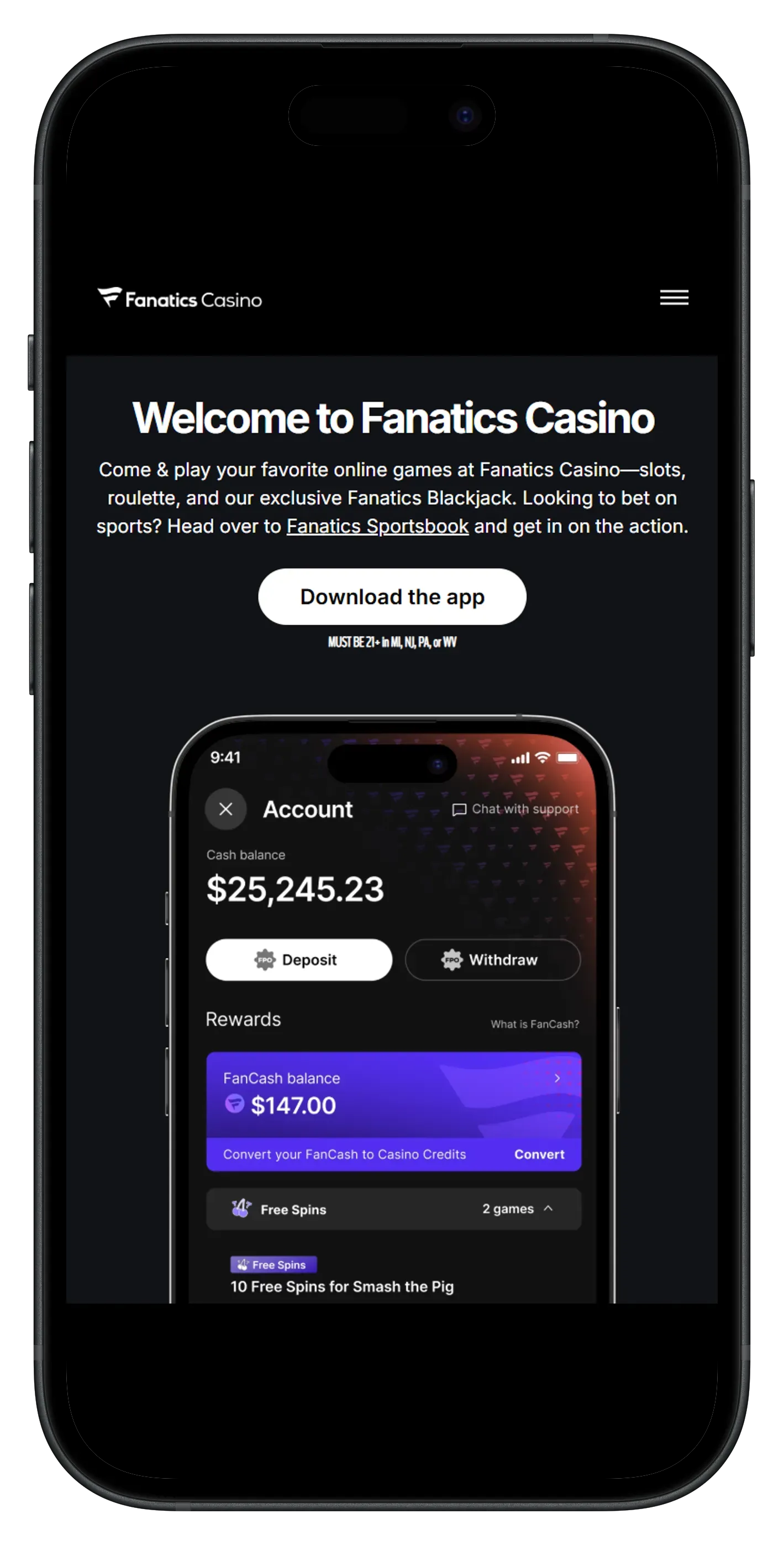 Fanatics is a mobile-first online casino. You’ll be able to access it using your mobile browser or by downloading the Fanatics Casino app for Android or iOS.