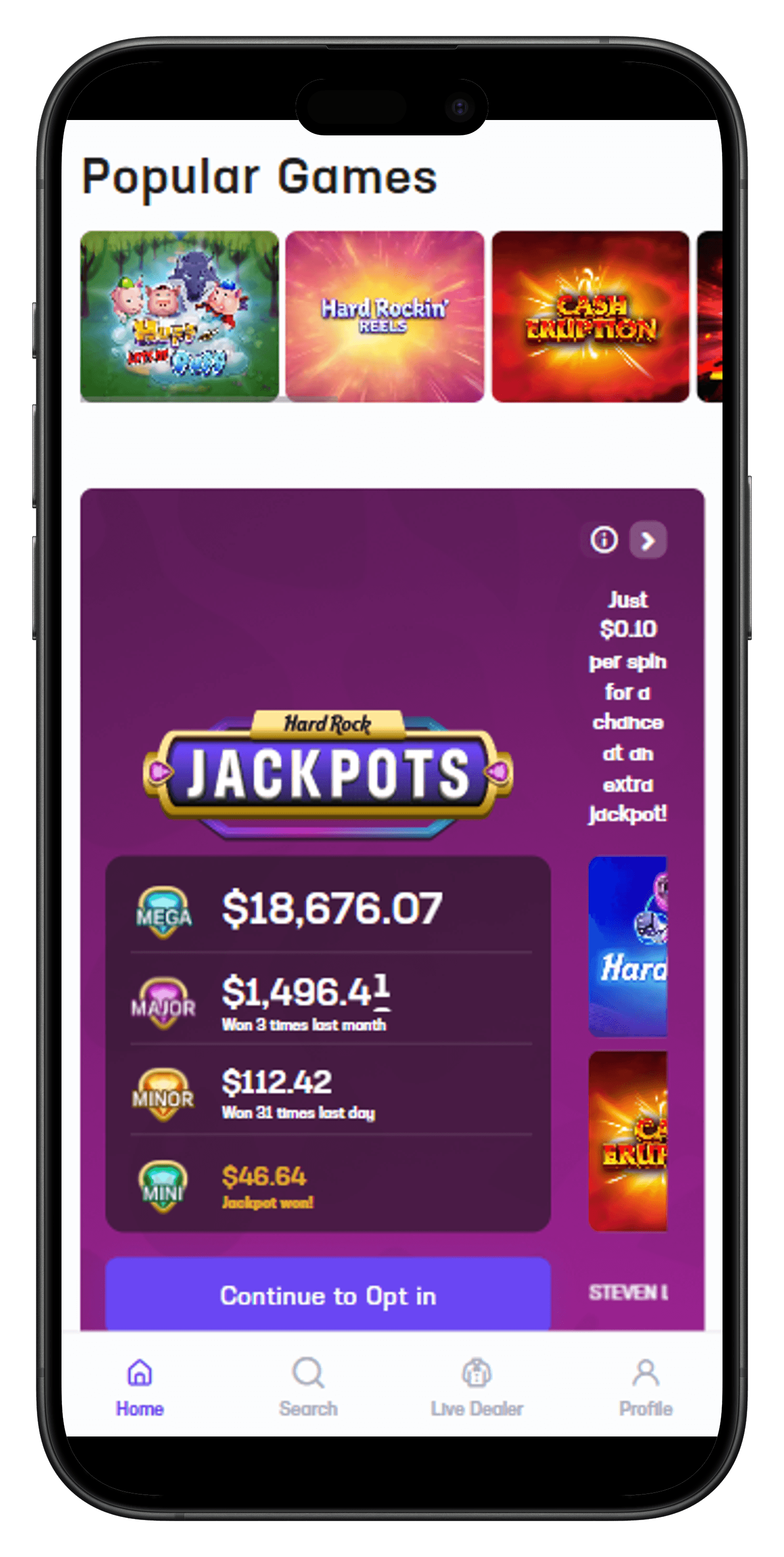 The mobile experience and design for Hard Rock Bet Casino is top notch for anyone that downloads the app. You will find a purple and black color scheme that is visually appealing along with notable sections marked for casino and sports. There are also numerous sections marked with in the casino tab where you can find games, promotions rewards, bonuses, and more!
