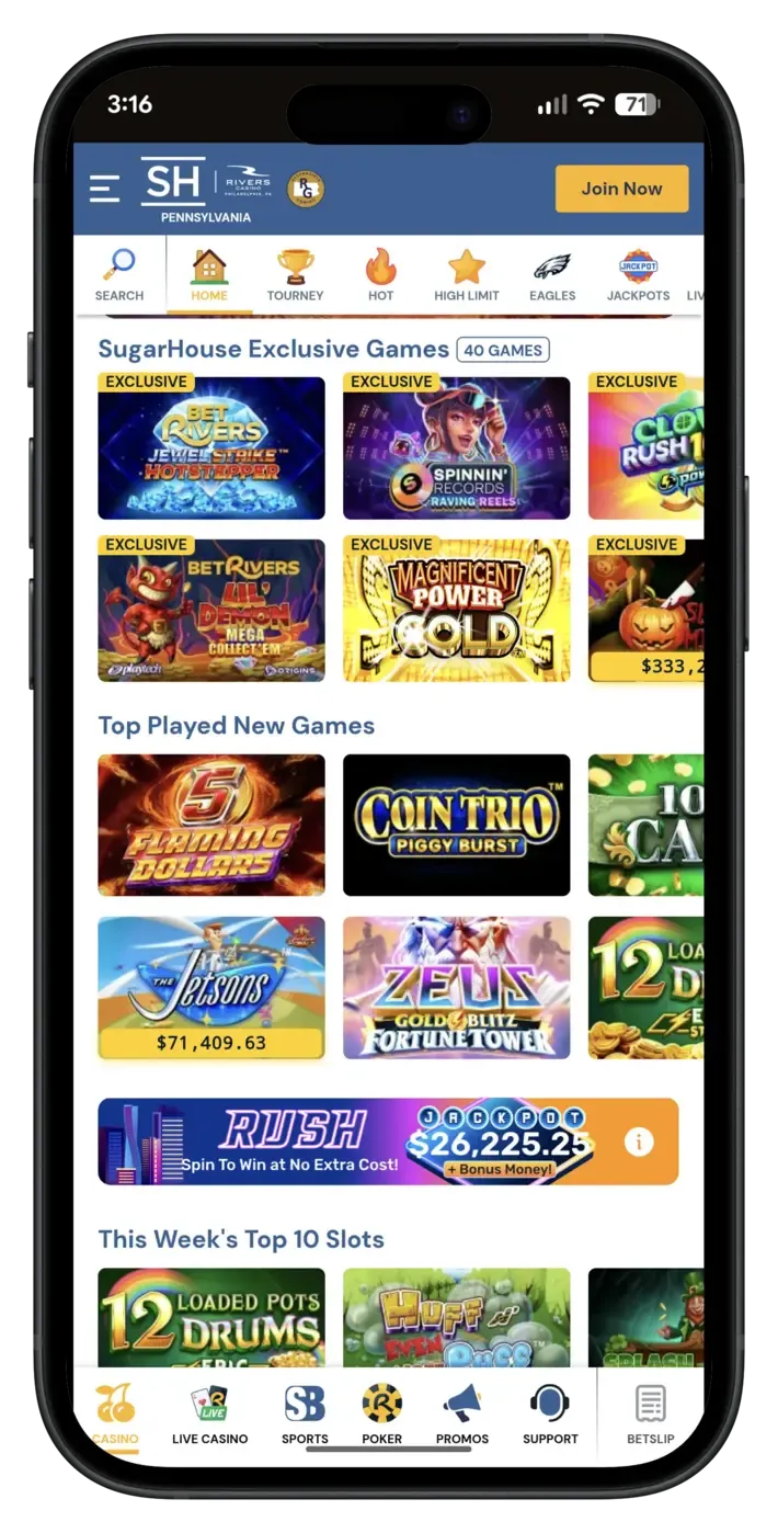 SugarHouse Casino only operates in Pennsylvania. Initially, PlaySugarHouse Casino was also available in New Jersey, but it has since been consolidated with BetRivers Casino NJ.