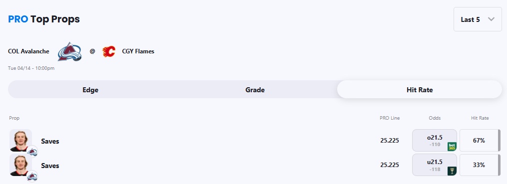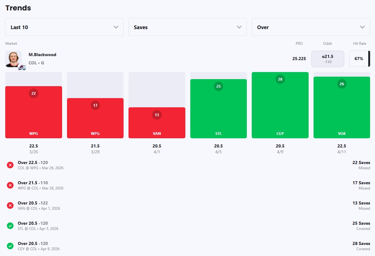 Action PRO projects Avalanche's Goalie Mackenzie Blackwood for 25.225 saves, giving us a solid 13.2% edge against the market compared to his current prop line of over/under 21.5, which is good enough to tag the Over with a B+ grade in our system.