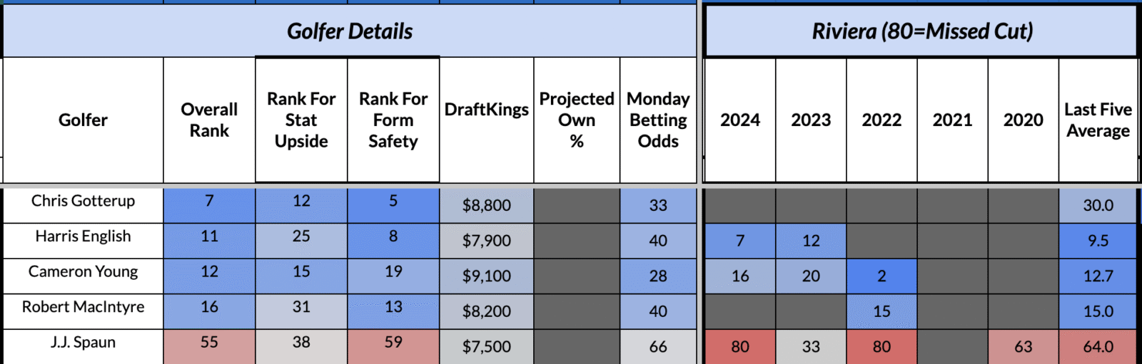 My math last week had Robert MacIntyre, J.J. Spaun, Harris English, Michael Thorbjornsen, Chris Gotterup and Cameron Young as the six most overpriced golfers on the slate at Pebble. You end up with a 10-2-2 sort of week when you correctly pinpoint the fade candidates, but there are two very interesting marks to mention from that list that could help find value at the Genesis.