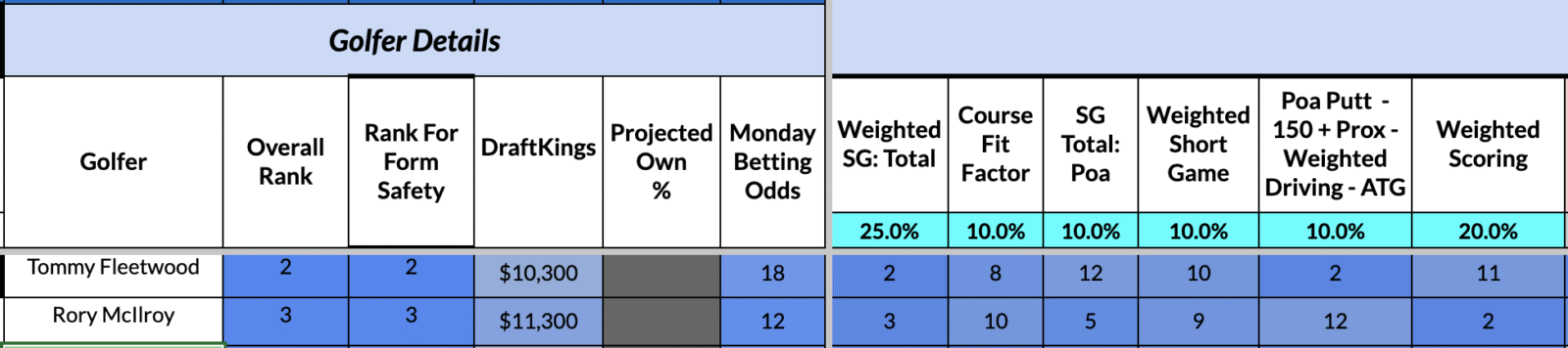 The math I run always shows Scheffler in his own class, and McIlroy and Fleetwood as very similar to one another. Upside grades for Fleetwood have continued to close that gap over the past six months, and there is a reason Fleetwood ranks as the second-best total strokes gained option in my model since 2025.