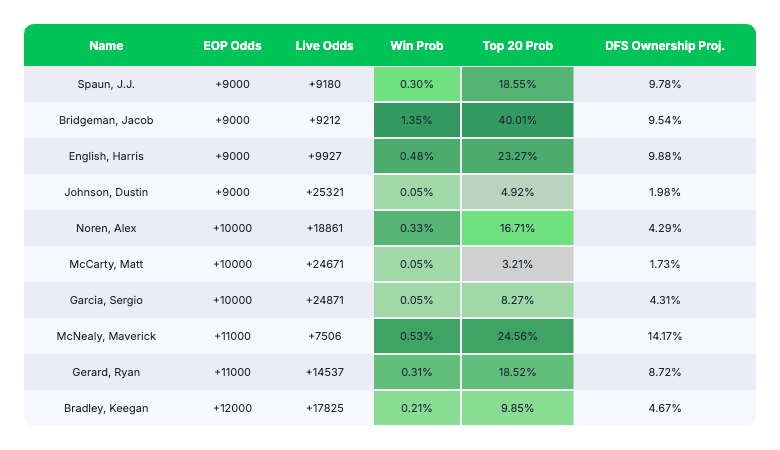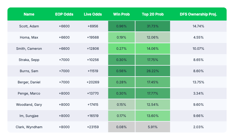 Tier 3 is a good reminder to not use the odds the pool sites give you, because they're way different from the live markets. Ben Griffin is 55-1 on Easy Office Pools; he's 181-1 at Pinnacle. Min Woo Lee is at the bottom of this tier at 66-1; he's 38-1 in real-time.