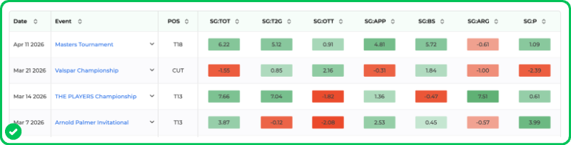 Now, looking at Harman’s last three starts, I really like the direction in which he's trending. He posted a T33 finish at Augusta last week and has gained strokes on approach in his last three starts.