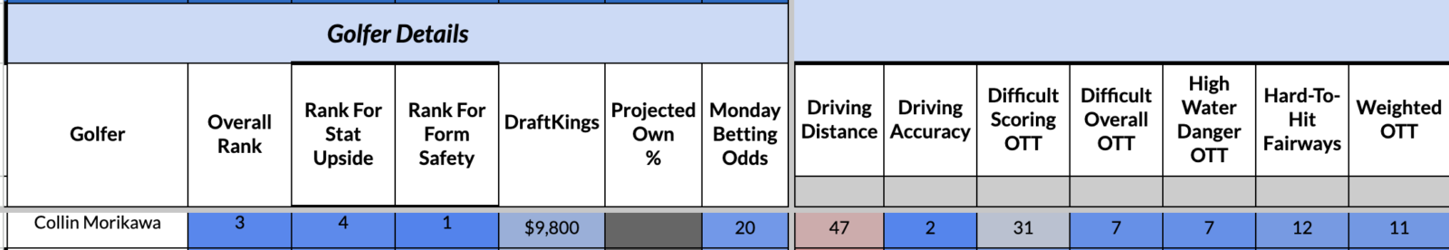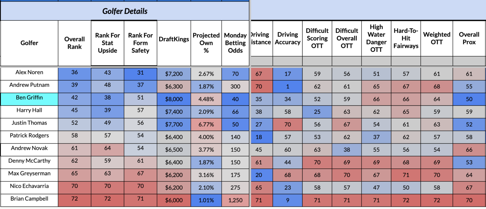 I understand that Griffin's short-game has found success in the past at similar tests, but it is hard for me to ignore a profile that ranks 50th (or worse) for both ball-striking categories.