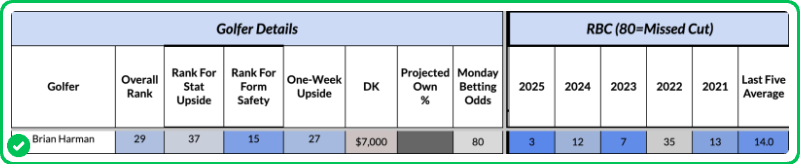 Do I think Harman wins this event? Probably not. That's why I built a different card in the outright market, although safety is never a bad thing to target, even if it comes within a no-cut tournament.