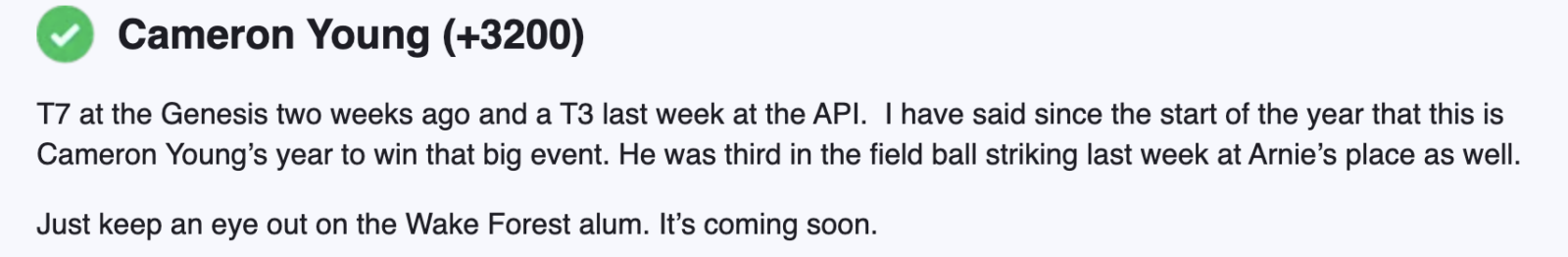Tournament of the year so far, if you ask me, and it's not even close. Massive congrats to Cameron Young on his second PGA Tour victory. We were right on it. I guess the “it’s coming soon” was “it's coming now.”