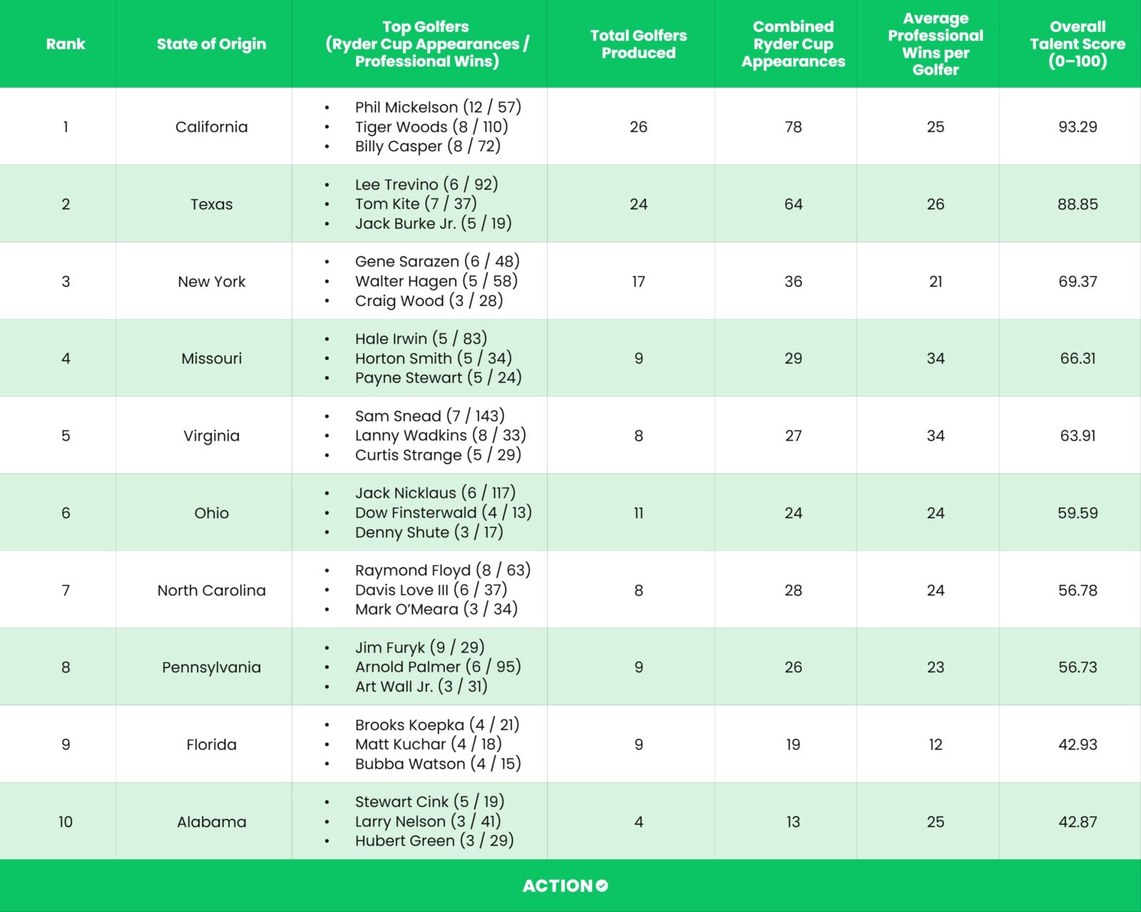 Additionally, for the “Top Golfers” column in the top 10 table, standout players from each state were highlighted using a blended formula that placed greater emphasis on Ryder Cup appearances (80%) and professional wins (20%).