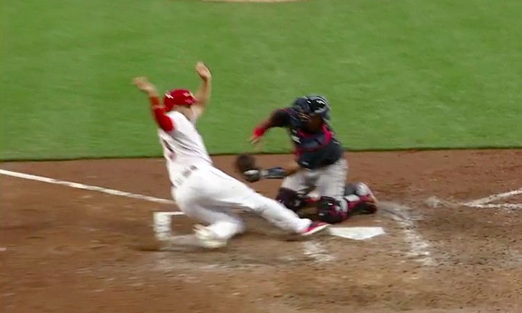 But, f***in' Carlos Perez, the Braves catcher, simply needed to lay down a tag on a throw that beat Duvall by, quote, unquote, fifteen feet? Tough pill to swallow. Come on, man. Carlos, tag in front of the plate — not the body. Carlos.