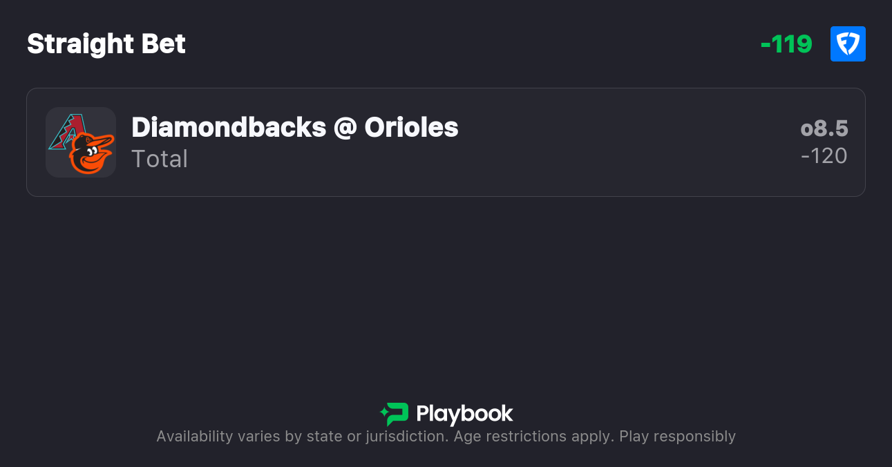 - Diamondbacks vs Orioles over/under: 8.5 (-120o / -102u)