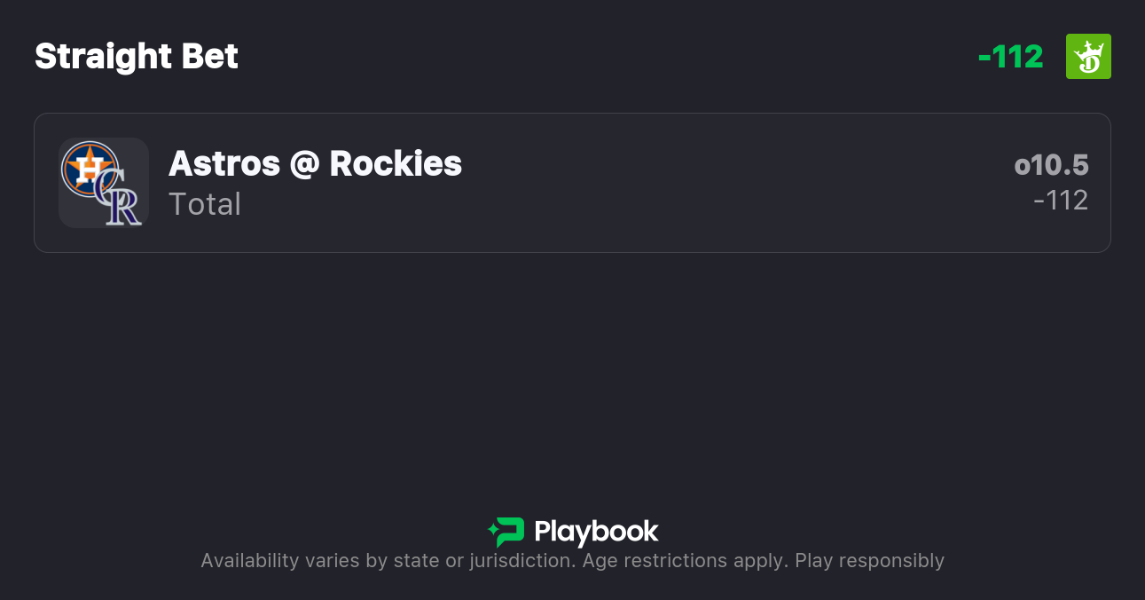- Astros vs Rockies over/under: 10.5 (-113o / -106u)