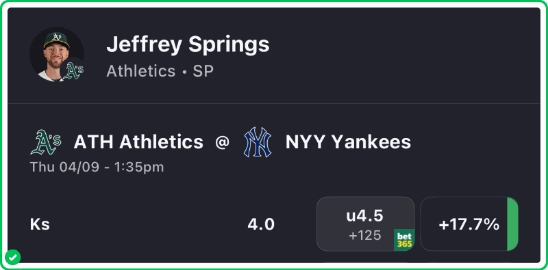- Athletics vs Yankees Pick: Jeffrey Springs Under 4.5 Strikeouts (+125) | Play to +100