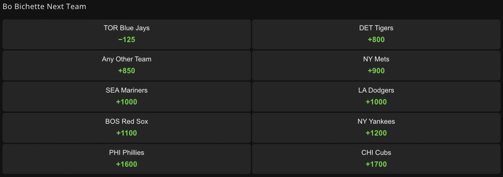 DraftKings has odds posted for where Bo Bichette will land for the 2026 season, with his former team favored to retain his services.