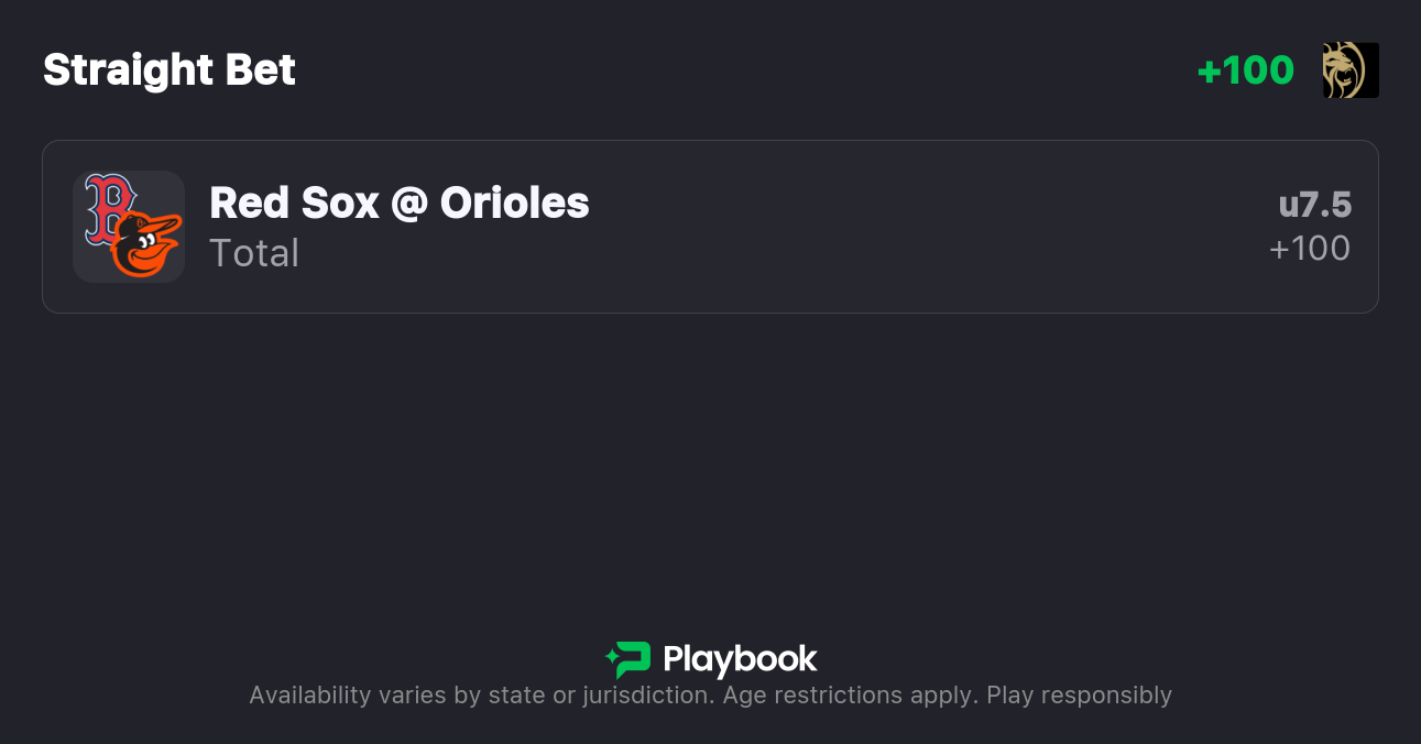 - Red Sox vs Orioles Pick: Under 7.5 (+100)
