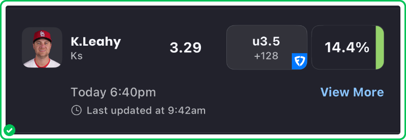 Action PRO projects St. Louis Cardinals starter Kyle Leahy for 3.29 strikeouts in his matchup against the Pittsburgh Pirates tonight, giving us a solid 14.4% edge against the market when compared to his current prop line of over/under 3.5 strikeouts, which is good enough to tag the Under with an A grade in our system.
