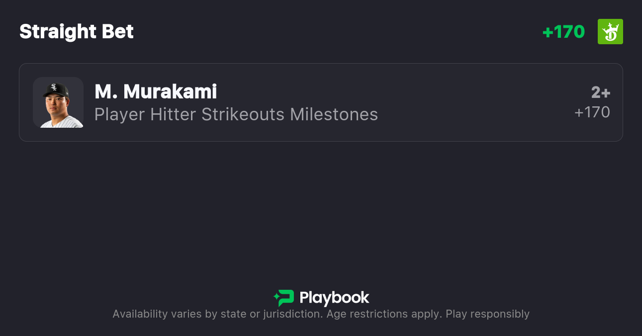 - White Sox vs Royals Pick: Munetaka Murakami 2+ Strikeouts (+170)