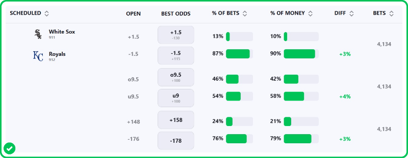 The Royals are favored by -194 on the moneyline and by -1.5 on the run line. The White Sox are +159 on the moneyline and +1.5 on the run line. The total is set at 9.5 runs.