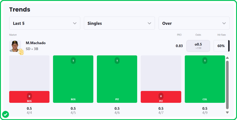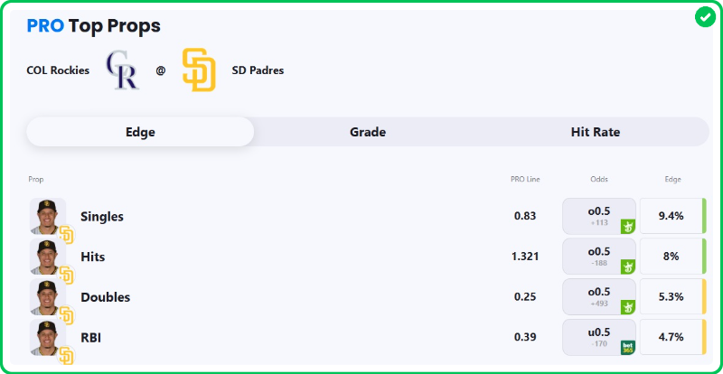 Action PRO projects the Padres star third baseman for 0.83 singles, giving us a solid 9.4% edge against the market when compared to his current prop line of over/under 0.5, which is good enough to tag the Over with a B- grade in our system.