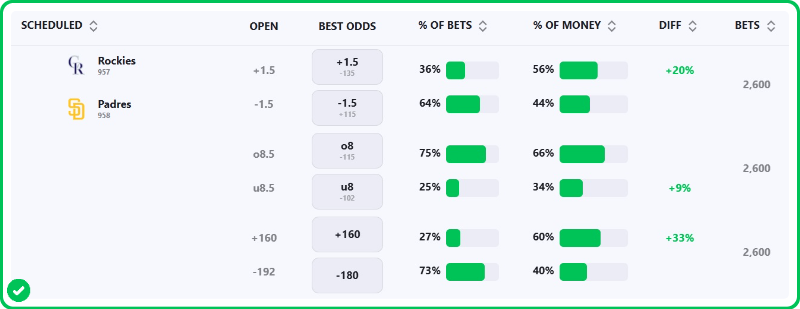 - Rockies vs Padres spread: Rockies +1.5 (-136), Padres -1.5 (+113)