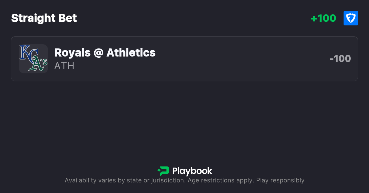 - Royals vs A's Pick: A's ML +100 (Play to -105)