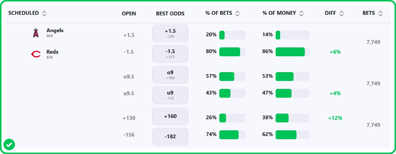 - Angels vs Reds spread: Angels +1.5 (-130), Reds -1.5 (+108)
