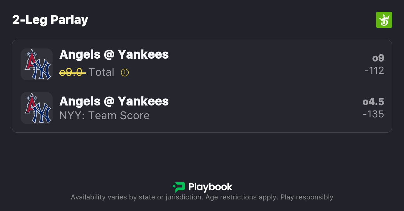- Angels vs Yankees Pick: Over 9 (-120 or better) | Yankees Team Total Over 4.5 (-135 or better)