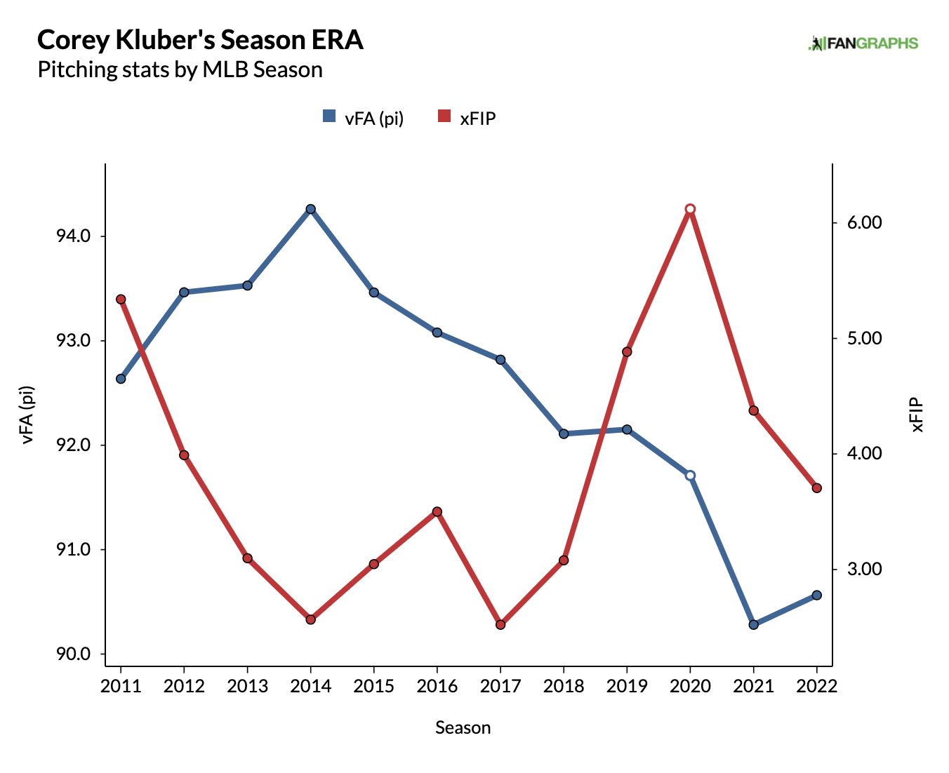 Kluber has posted his best walk rate (4.8%) since 2018, when he won 20 games for Cleveland. However, his velocity has continued to tumble, down 3.7 MPH compared to his last Cy Young campaign in 2017.