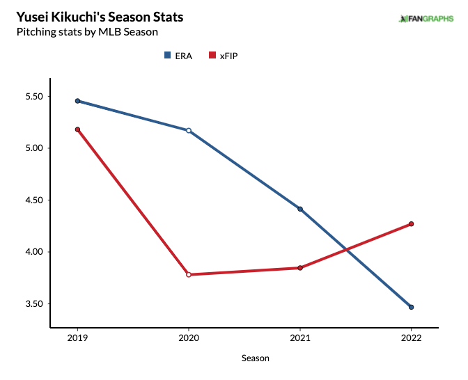 Kikuchi is as enigmatic of a pitcher as you can find in the majors. His walk rate (14.8%) is unbearably high, ranking amongst the Joan Adons of the world. Still, he's underperformed relative to his expected metrics for a large part of his career.