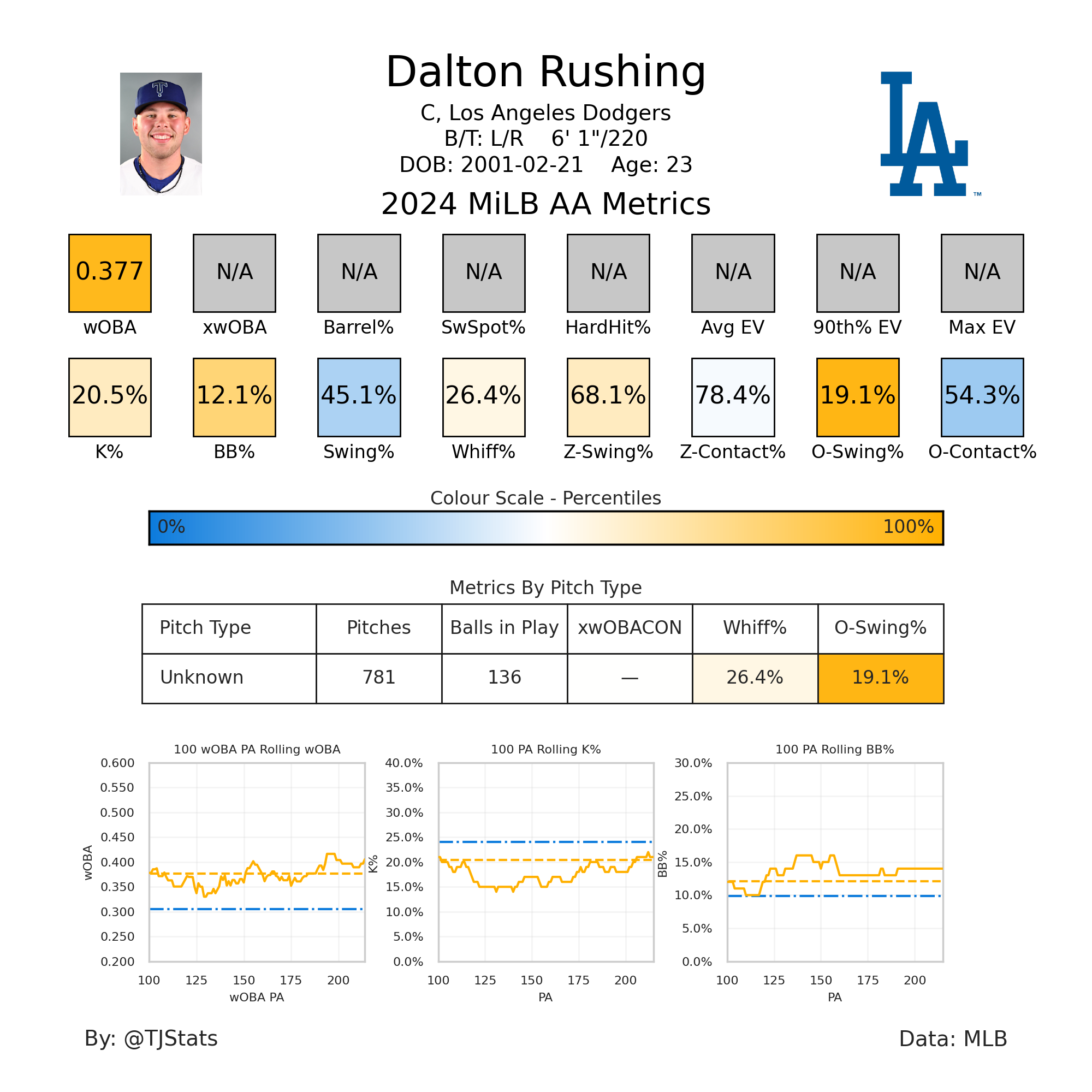 The only consensus top-50 prospect in the system is Dalton Rushing, a hard-hitting, slugging catcher who has moderately improved his plate discipline this season at Double-A Tulsa (12% walk rate, 20% strikeout rate). He’s trending up defensively and already looks like a draft-day steal.