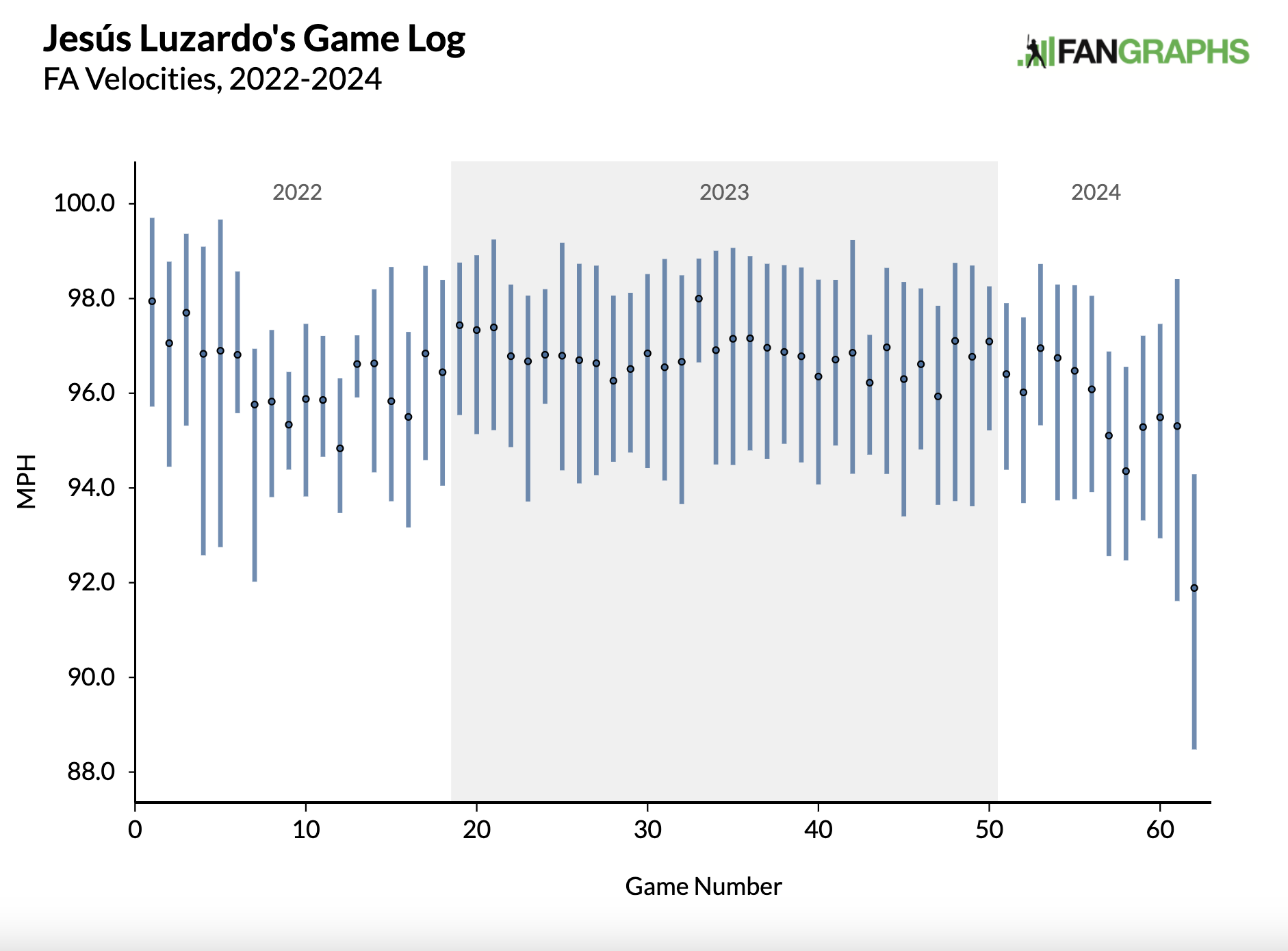 Despite a slight decrease in velocity (96.8 mph in 2023, 95.5 in 2024) and Stuff (104 in 2023, 94 in 2024), he’s still among the highest-upside southpaw arms in baseball. When his fastball-slider combination is working, he can sustain 30% strikeout rates.