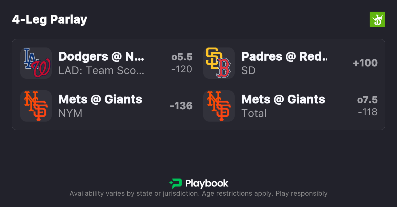 Our staff is locked in. We’ve got bets on nearly every game, but here are four of our favorites for Nationals vs. Dodgers, Padres vs. Red Sox, Cubs vs. Guardians, and Mets vs. Giants.