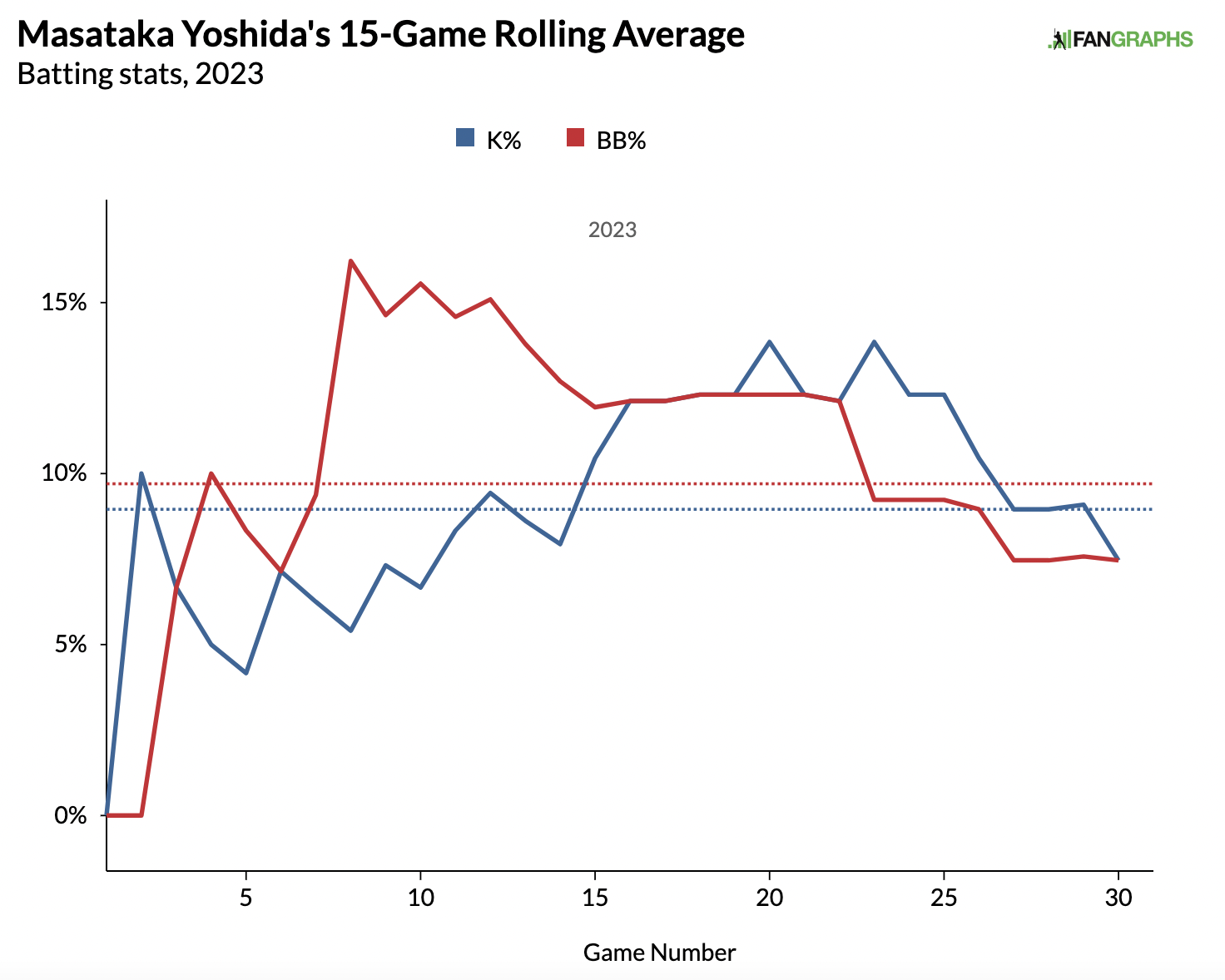 And unsurprisingly, Yoshida’s plate discipline and bat-to-ball skills have never fallen off.