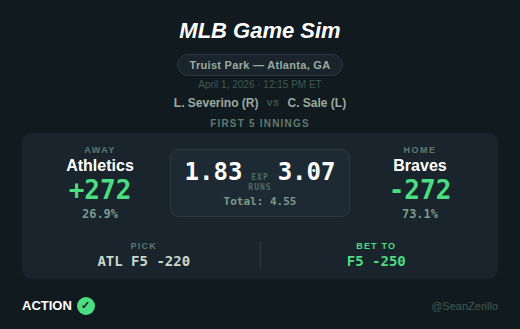 I projected the Braves near -275 for the first five innings (F5), but priced them closer to -230 for the full game. The gap between Sale and Severino (about 1.5 runs on a weighted FIP projection) is larger than the gap between the bullpens (closer to three-quarters of a run).