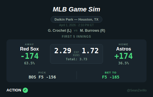 Houston's offense actually projects better against lefties than righties by about 3 points in wRC+, but I still show an edge on Crochet in the first half; bet Boston's F5 moneyline at -165.