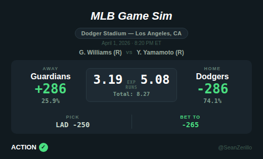 My projection went from around -260 with DeLauter in Cleveland's lineup to -286 without him, and I would bet the Dodgers up to -265 straight, or -270 as a parlay piece.