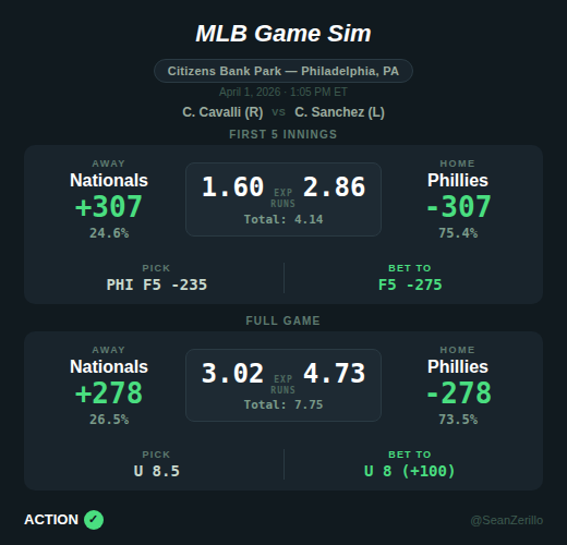 Lastly, if my full-game projection stays in the current range (around -280), I'd consider using the Phillies' full-game line as a parlay piece to -260.