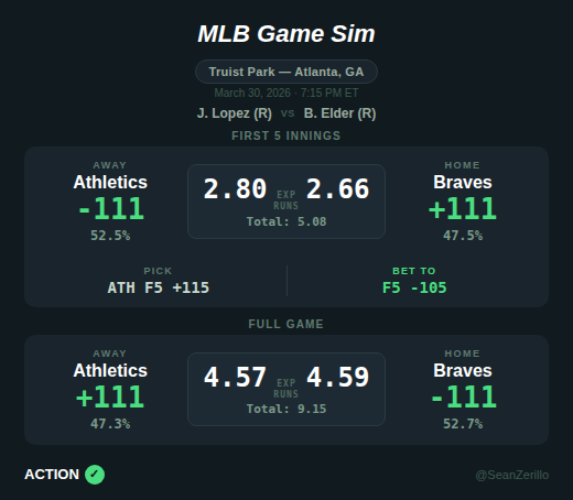 Due to a drastic difference in bullpen quality, I project the Athletics as near -110 favorites for the first five innings, but make the Braves around the same price for the full game.