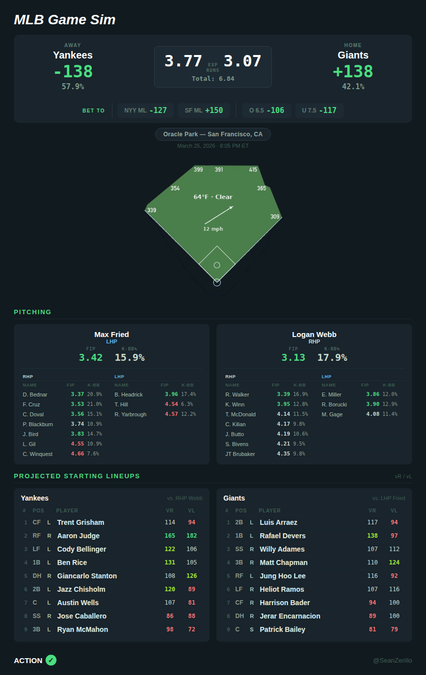 The goal for Opening Pitch is to highlight top daily projection edges for MLB moneylines and totals, share my favorite bets and props, and provide some betting notes and analysis. For Wednesday, I preview the opening night game on Netflix between the Giants and Yankees.