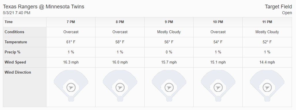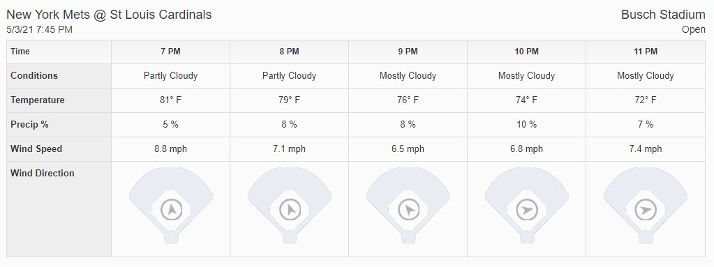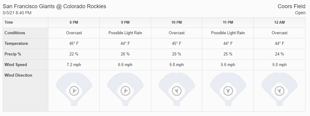 Finally, in Colorado things should probably be fine for the 8:40 p.m. ET first pitch between the Giants and Rockies, but light rain is expected at various points throughout the evening, so this one is worth keeping an eye on as well.