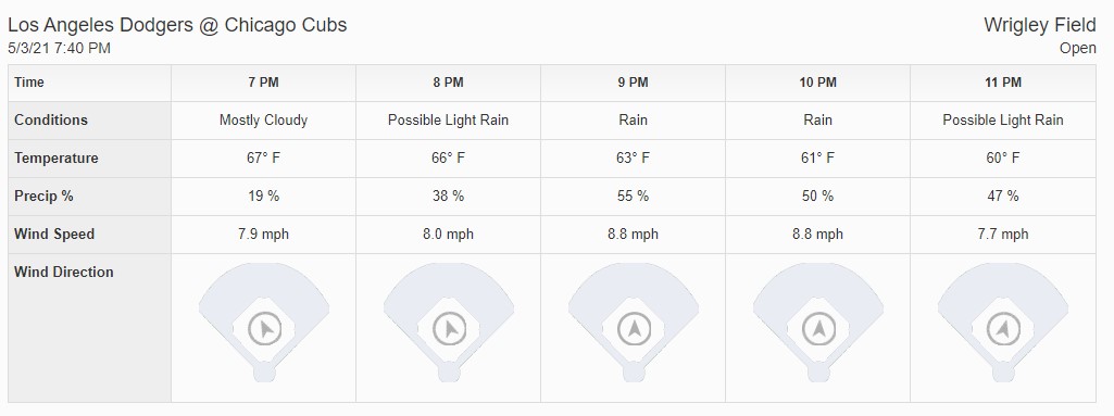 In Chicago, the 7:40 p.m. ET first pitch between the Dodgers and Cubs appears fine, but there's some light rain in the forecast that gets heavier around 9 and 10 p.m. ET.