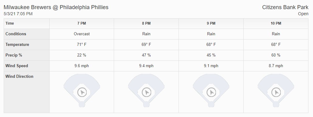 In Philadelphia, the forecast for the 7:05 p.m. ET first pitch between the Brewers and Phillies looks fine, but rain is in the forecast from the 8 p.m. hour on with the precipitation increasing as the night goes on.