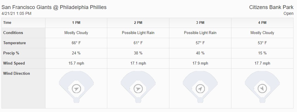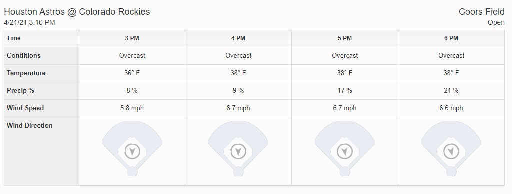 In Colorado, the 3:10 p.m. ET first pitch between the Astros and Rockies looks fine, but the precipitation % increases throughout the day, making it possible that the game starts on time but is later delayed.
