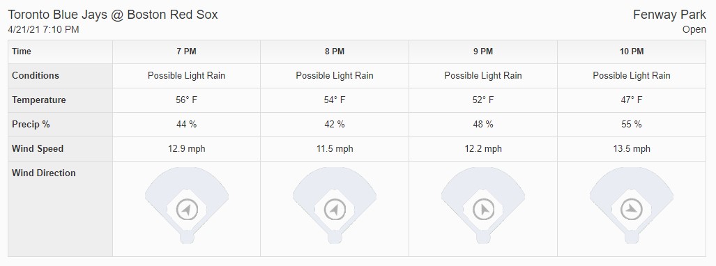 Finally, in Boston, Blue Jays-Red Sox is probably the main postponement risk. There's 44% precipitation and possible light rain at 7 p.m. ET and that doesn't improve and in fact gets worse throughout the night. Avoiding fantasy players in that game is recommended.